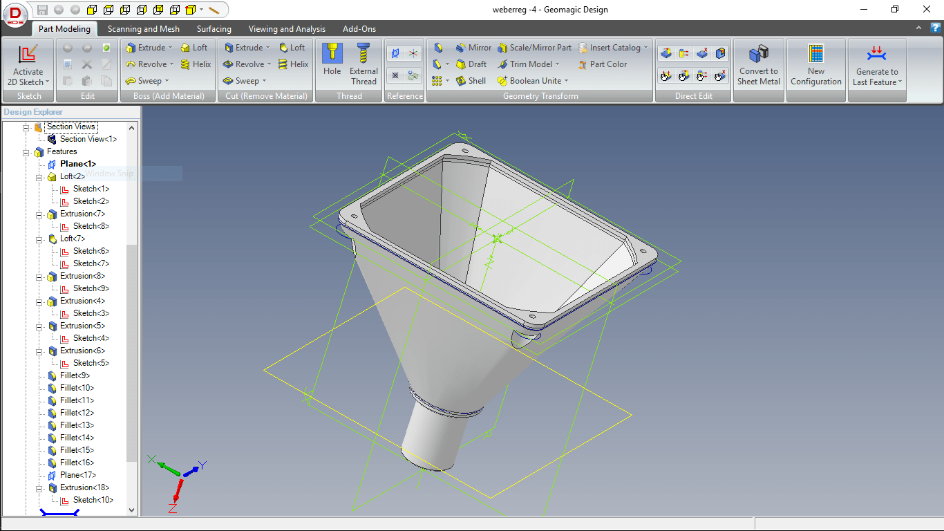 Alibre / Geomagic var utroligt nemt at lære… Det er baseret på at man vælger en flade (et plan eller en flade på et andet objekt), tegner en 2d-figur (med dimensioner og constraints der binder elementerne sammen) og bruger så den til enten at tilføje eller fjerne materiale fra modellen. Der forskellige smarte måder at tilføje/fjerne materiale på – så det er utroligt fleksibelt trods den nemme betjening.