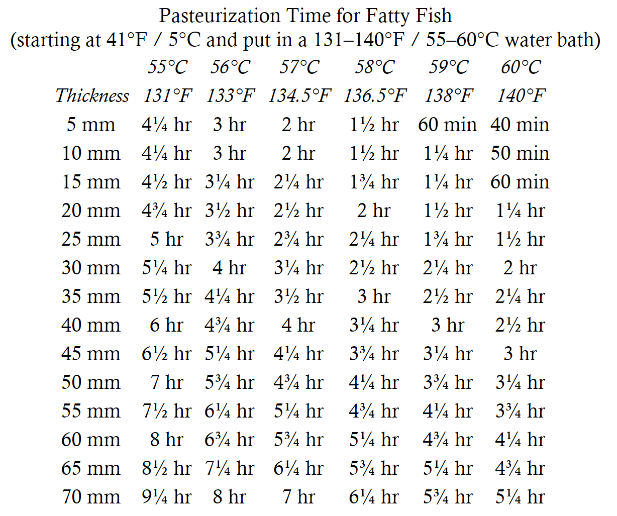 Af tabellen ovenfor kan vi se, at et stykke cylinderformet oksekød på 55mm kræver 2½ time om at opnå 55 degC. Men skal vi være sikre på bakterierne, skal kødet have 4½ time! Man kan komme i den situation, at pasteuriseringstiden er lavere end opvarmningstiden. Man skal altid vælge den højeste af de to – for ellers bliver det enten ikke pasteuriseret, eller også når den ikke den rette kernetemperatur.