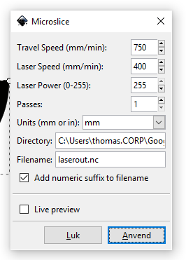Meeen – nu er der jo det ved det at jeg bruger MACH3 i fræseren. Outputtet fra Inkscape plugin’en er jo G-kode så det burde bare virke… Men G-kode der kommer ud af laserengraving plug-in’en er altså ikke kompatibel med MACH3. Efter nogle forsøg lykkedes det at fikse det: